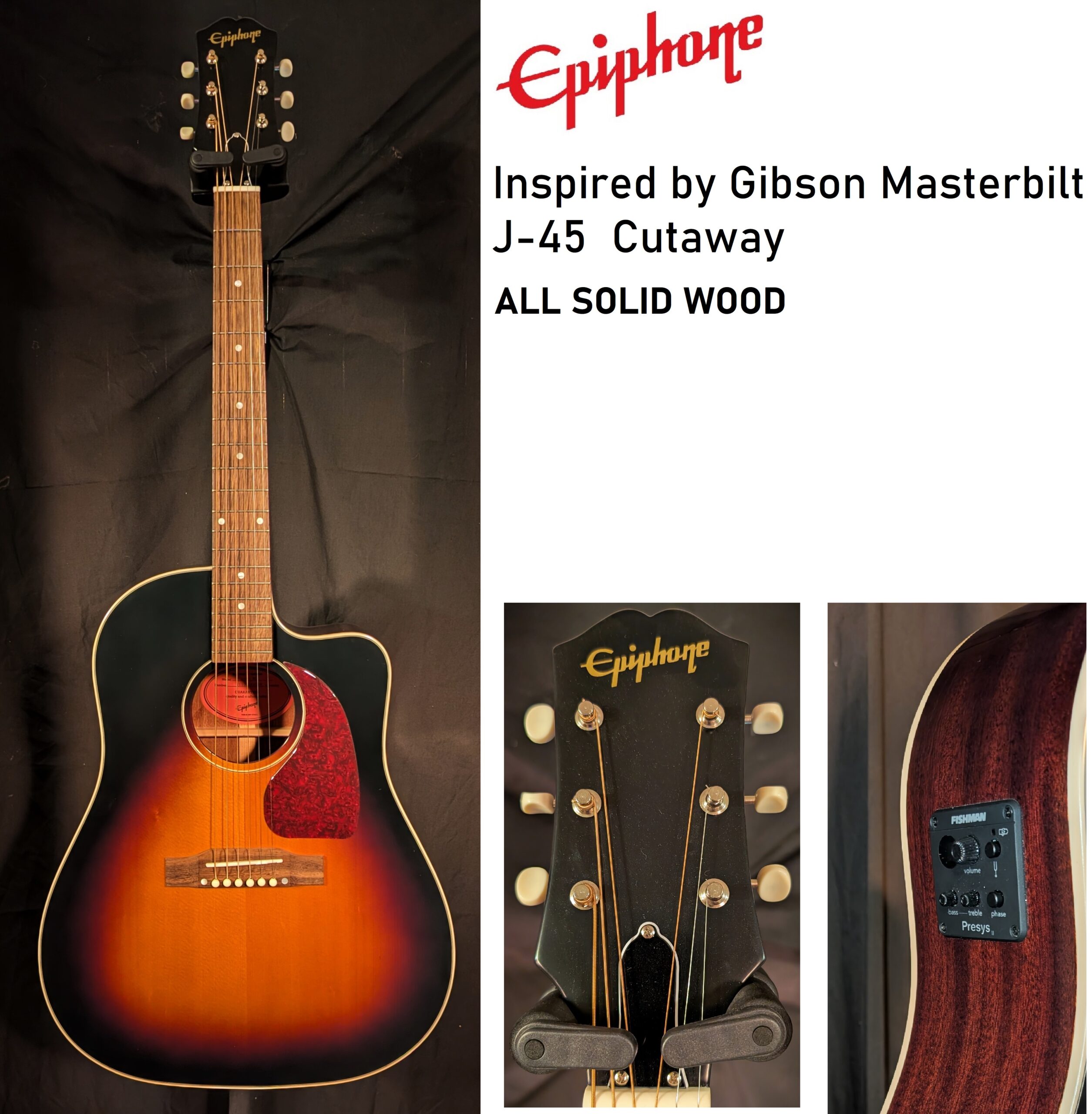 Epiphone J45 Cutaway with Fishmen Pick-up system .All solid wood Guitar ..The legendary Gibson™ J-45™ has been a favorite of musicians ever since it was first introduced in 1942. Now Epiphone has released a new Inspired by Gibson™ J-45 Cutaway that gives players improved access to the upper frets while retaining all of the features that make the J-45 special to begin with, including the Sloped Shoulder body with a solid Sitka spruce top and solid mahogany back and sides, a comfortable rounded C neck profile, Fishman® Sonicore™ under-saddle pickup and Fishman Sonitone™ preamp with soundhole mounted volume and tone controls, and a beautiful Aged Vintage Sunburst finish.