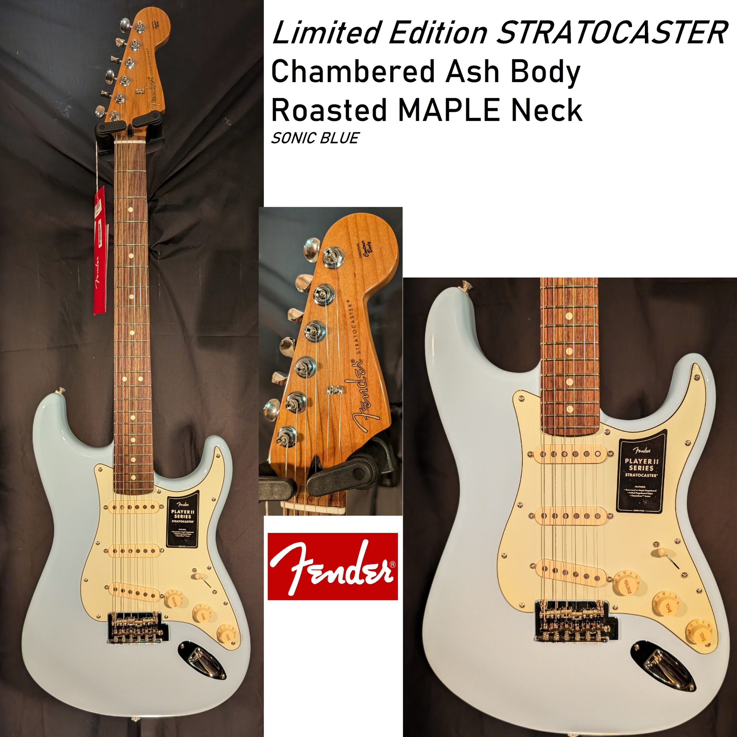 Fender Limited Edition Player II Stratocaster Chambered Ash Body,Roasted Maple Neck,Sonic Blue,Alnico 5 Pick-ups. 2-point tremolo and ClassicGear™ tuners ensure precise tuning stability for the flexibility to explore endless sonic possibilities.