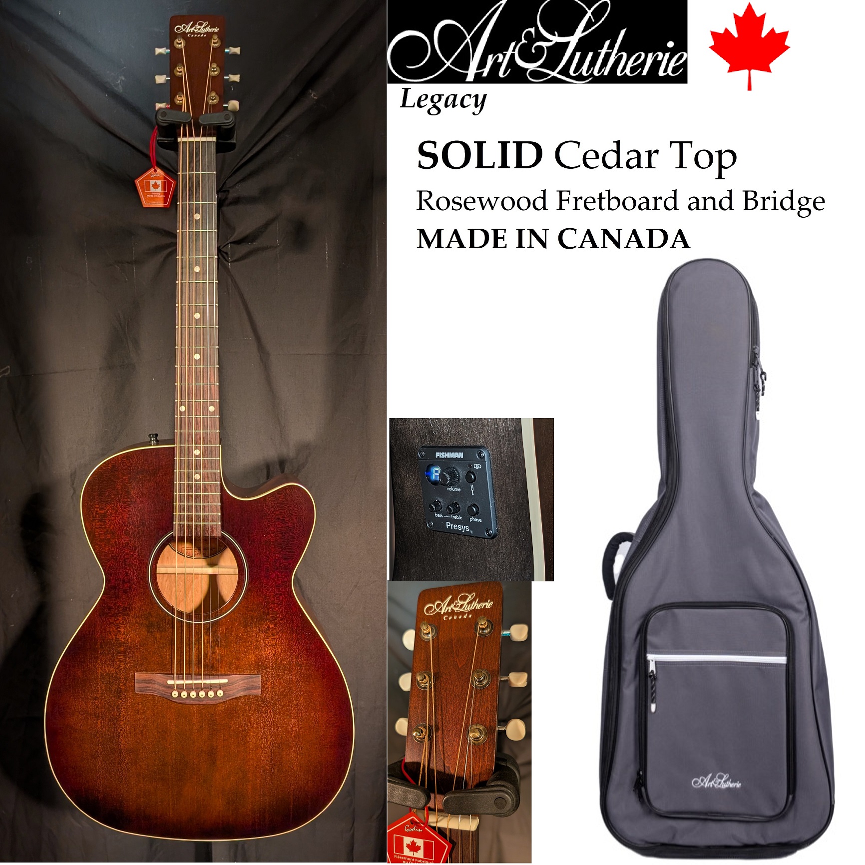 Legacy Bourbon Burst CW Presys II Includes NO CHARGE Gig Bag SOLID Cedar Top,Rosewood FretBoard and Bridge,Cutaway Folk Size Body.Bourbon Burst Finish,Fishman PRESYS Pick-up Tuner.MADE IN CANADA